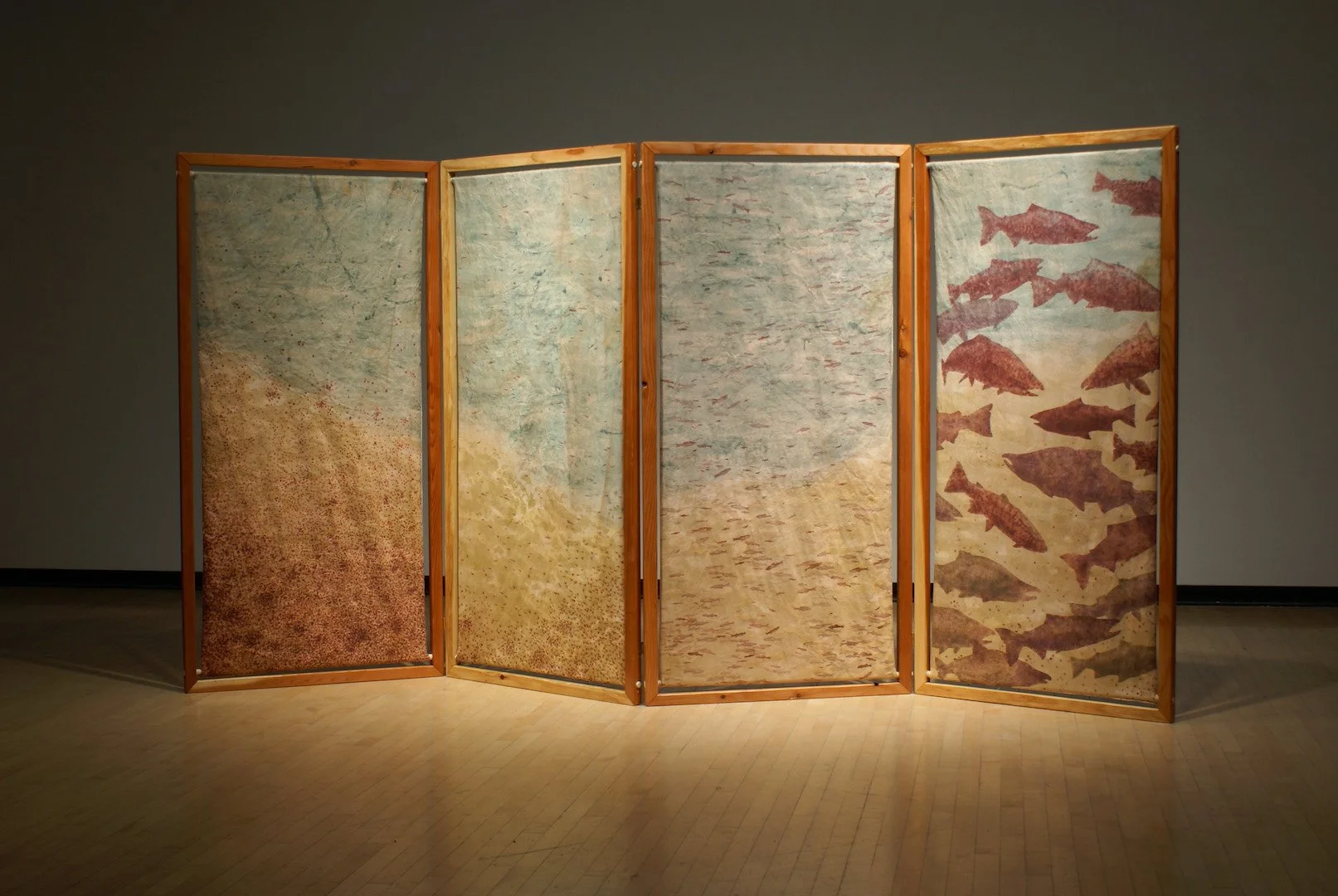 In collaboration with my partner, Michael Nannery. This space divider (byōbu) pays tribute to the life cycle of the sockeye salmon, which spawn in lakes, rivers, or streams, but spend most of their adult life in the Pacific Ocean. Sockeye salmon can be found between northern California and northern California. Through their generational sacrifice, salmon feed and fertilize the forest and its habitants. Their gift of life is paramount.