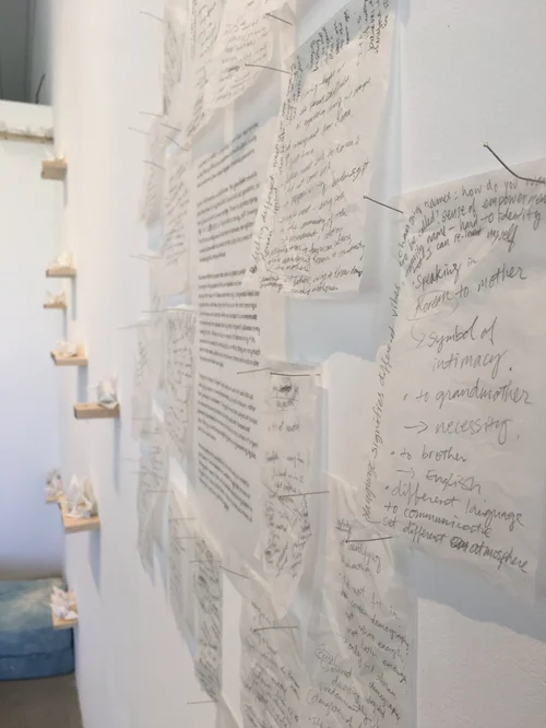 Originally started in 2019, this work was shown both at Painting & Sculpture Outpost in Marysville, CA and Flux Art Space in Long Beach, CA. On each origami paper, a transcript of a conversation with my father was screen printed. The conversation was about reaching out to someone I had difficult relationship with, and finding out his experience of growing up as a Korean person in Japan in the post-WWII era. Inspired by the Japanese tradition of thousand paper cranes, a form of ritual and prayer for the impossible, the origami was then folded into cranes with participants, while engaging in conversation about their experiences of feeling “othered”. The stories shared were collected and became part of the evolving installation in the gallery.